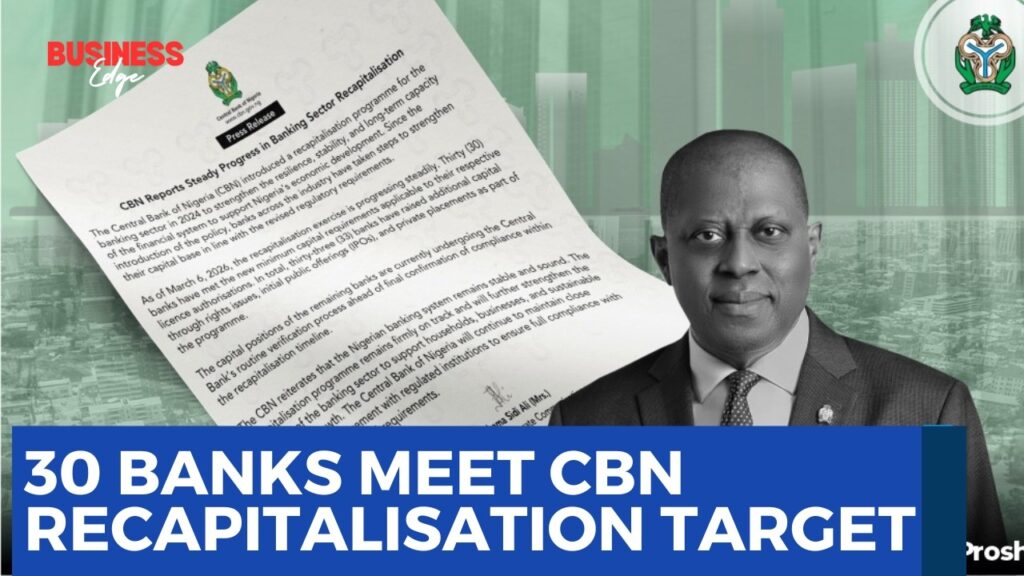 As at today, 12th March 2026, 30 banks out of the 35 banks operating in the country have met the recapitalisation requirement of the Central Bank of Nigeria, CBN, according to findings by Vanguard.