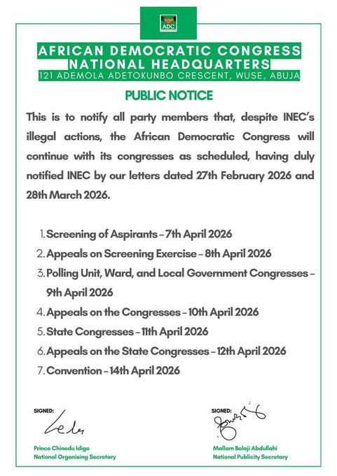 According to the schedule, screening of aspirants will begin on April 7, followed by polling unit, ward, and local government congresses on April 9. State congresses are set for April 11, while the National Convention will take place on April 14, 2026. The timetable was jointly signed by National Organizing Secretary Chinedu Idigo and National Publicity Secretary Bolaji Abdullahi.