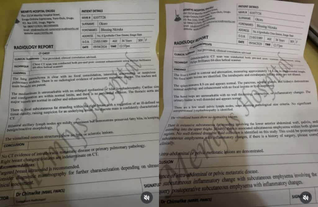 During an interview on Arise TV, a Nigerian medical doctor, Dr Adefunke Arowolo, exposed Blessing for fabricating her cancer result. While on the show, Blessing presented a medical report, which turned out to be the same viral document a family is currently suing her over, unknowingly to her, that the doctor contacted the said doctor whose name appeared on the document.