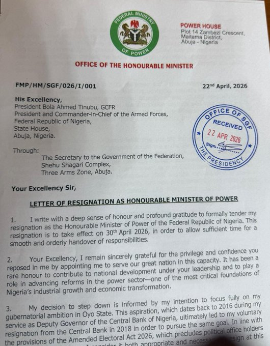 According to reports, Adelabu submitted his resignation letter dated April 22, 2026, through the Secretary to the Government of the Federation, with his exit set to take effect on April 30, 2026.
