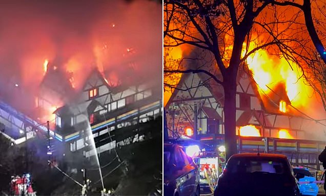 12 fire crews scrambled to fight the fire, which could be seen ravaging the building in drone footage while thick plumes of smoke rose billowed upwards.