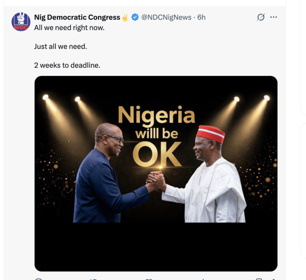 The Nigeria Democratic Congress (NDC) has called on Peter Obi and Rabiu Kwankwaso to defect to its platform and run in the 2027 presidential election.