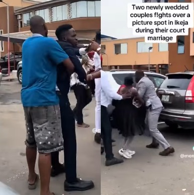 A video circulating on social media has captured the moment two newly married men got into a physical altercation at a marriage registry in Lagos over a spot for taking pictures.