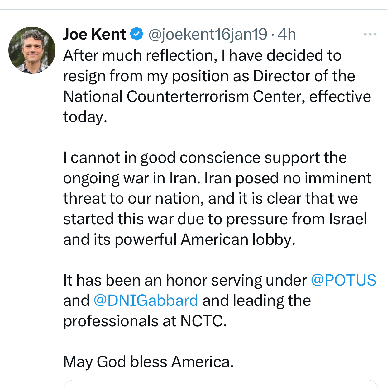 “I cannot in good conscience support the ongoing war in Iran. Iran posed no imminent threat to our nation, and it is clear that we started this war due to pressure from Israel and its powerful lobby,” Joseph Kent wrote in a letter to Trump posted on X.