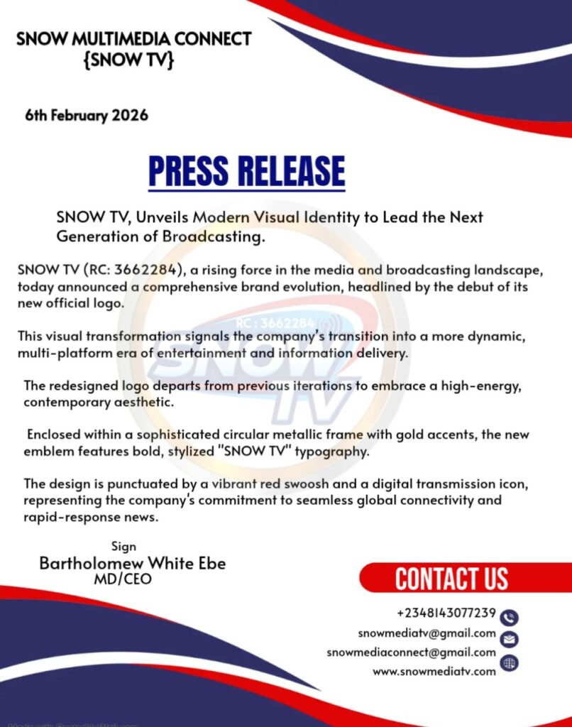 “Our new identity reflects a company that is constantly in motion,” said Bartholomew White Ebe The MD/CEO of SNOW TV. “By incorporating our corporate registration May 2022 (RC: 3662284) directly into the visual mark, we are emphasizing our transparency, legitimacy, and the professional standards our viewers expect from us in 2026 and beyond.”