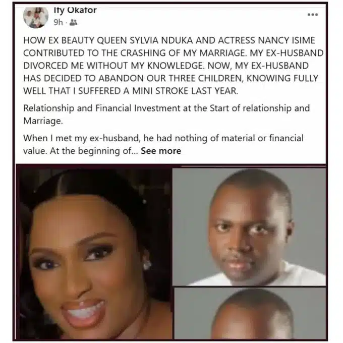 A Nigerian woman living in the United Kingdom, Ify Okafor, has accused actress Nancy Isime and former beauty queen Sylvia Nduka of allegedly being involved in the breakdown of her marriage to businessman Chinedu Nwobodo, the owner of Circa Lagos.