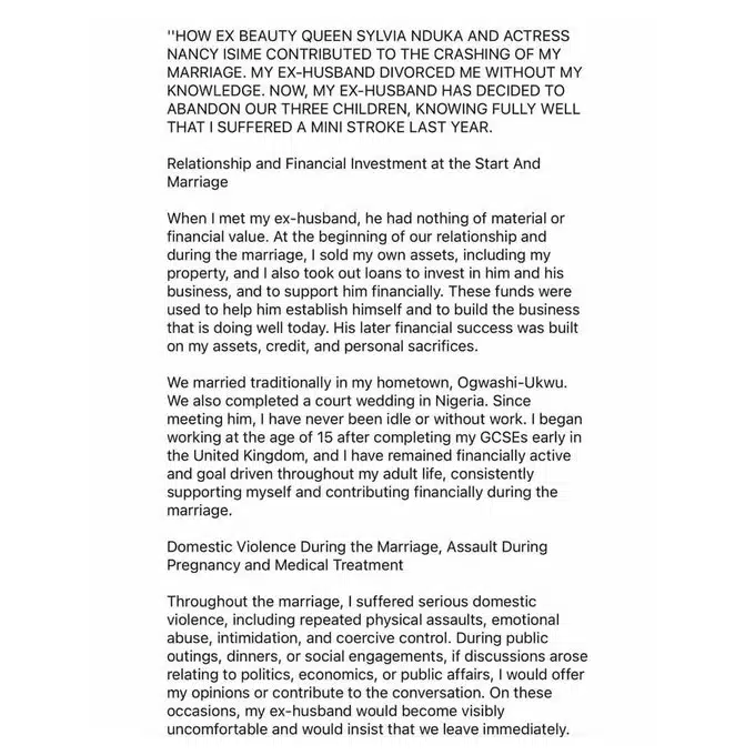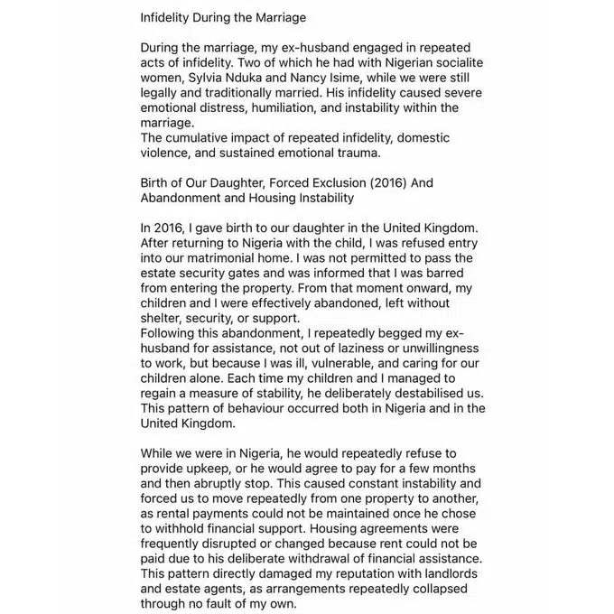 She stated that some of the alleged affairs took place while they were still legally and traditionally married. In her account, she claimed that the purported relationships involving Nancy Isime and Sylvia Nduka caused her immense emotional pain, humiliation, and turmoil within her home.
