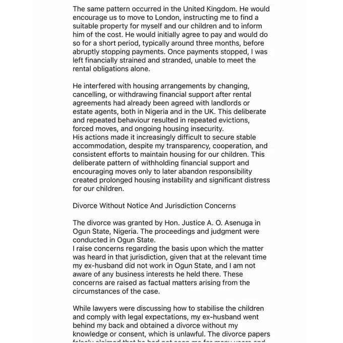 She added that whenever she and the children began to recover and regain stability, her ex-husband would allegedly resurface and disrupt their lives again, a pattern she claimed occurred both in Nigeria and the United Kingdom.